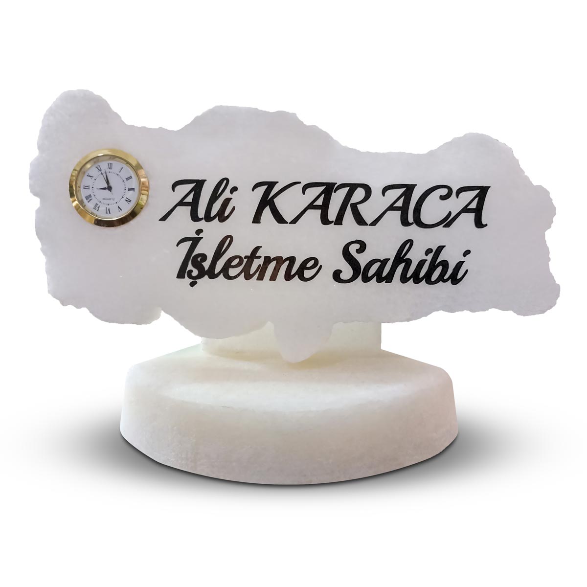Türkiye Harita Saat İsimlik adlı ürün Türkiye Haritası şekli ve üzerinde yer alan saat ile ofisinizde masanızı süsleyecek, şık ve dekoratif üründür. Masa üzerindeki isimliğin ehemmiyeti malumunuzdur. Zira sizi ziyarete gelen ziyaretçi veya müşteri isminizi unuttuğunda, veya isminizi bilmediğinde, size karşı hitap karmaşası yaşamaması, o ana kadar zaten sizinle sohbet ederken, adınızı bilmediği için mahcubiyetle adınızı sormaması içindir. Ayrıca isminizin altında unvanınız veya makamınız yazar. Böylece sizi ziyarete gelenler, isimlik sayesinde, isminizi veya unvanınızı isimlik üzerinde görerek bir hitap karmaşası yaşamaz.